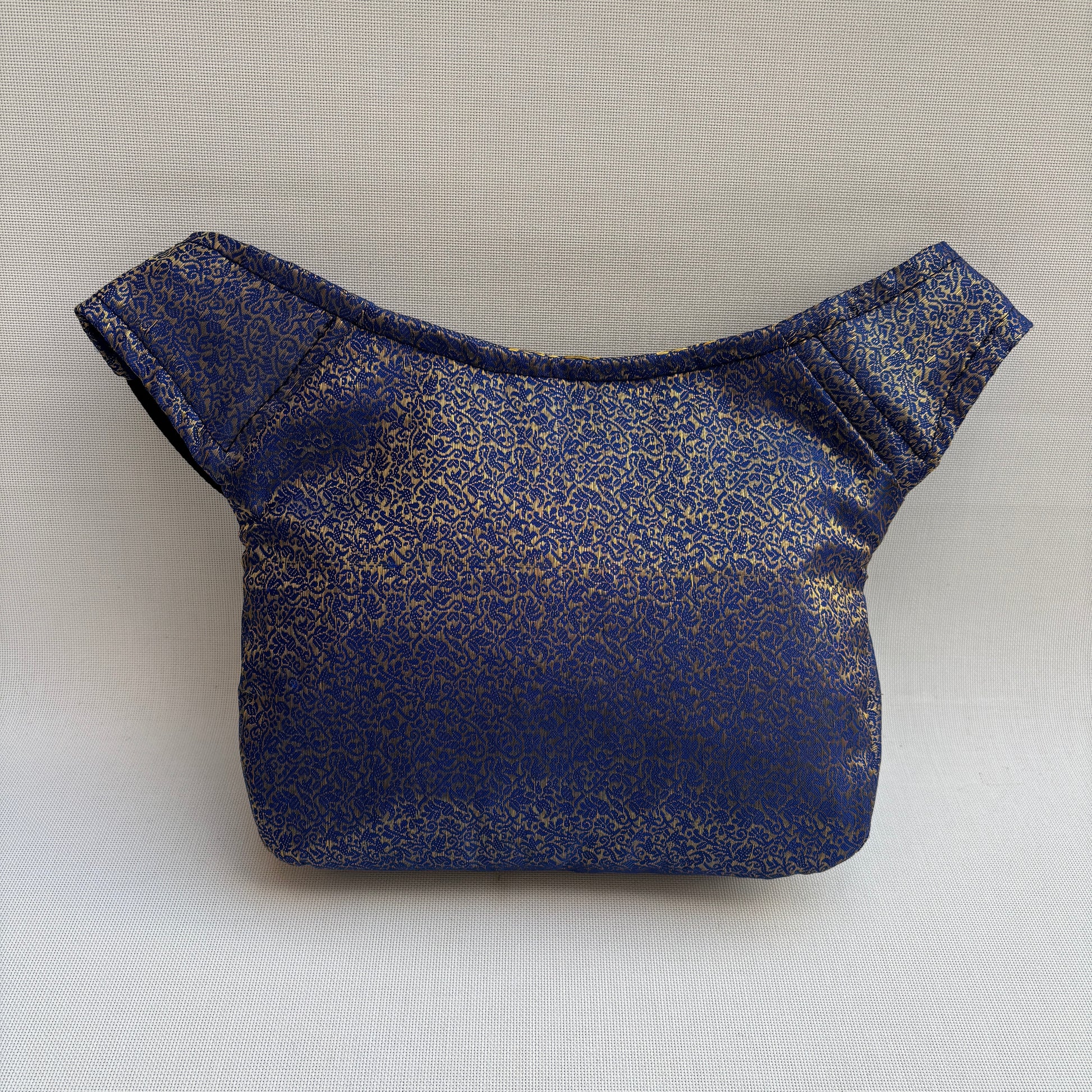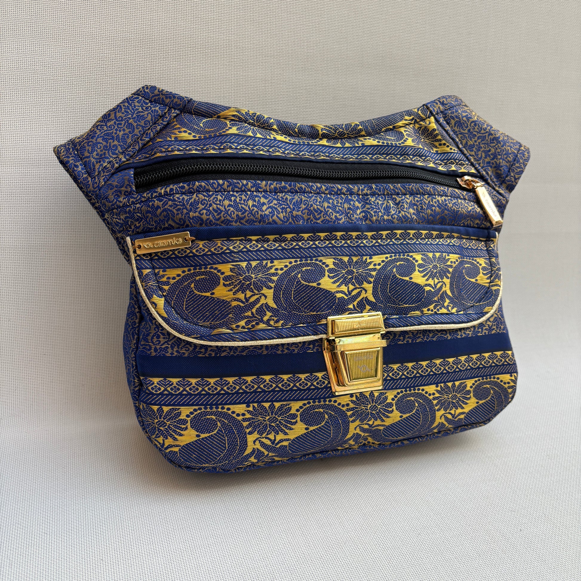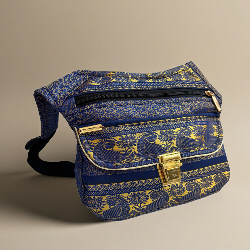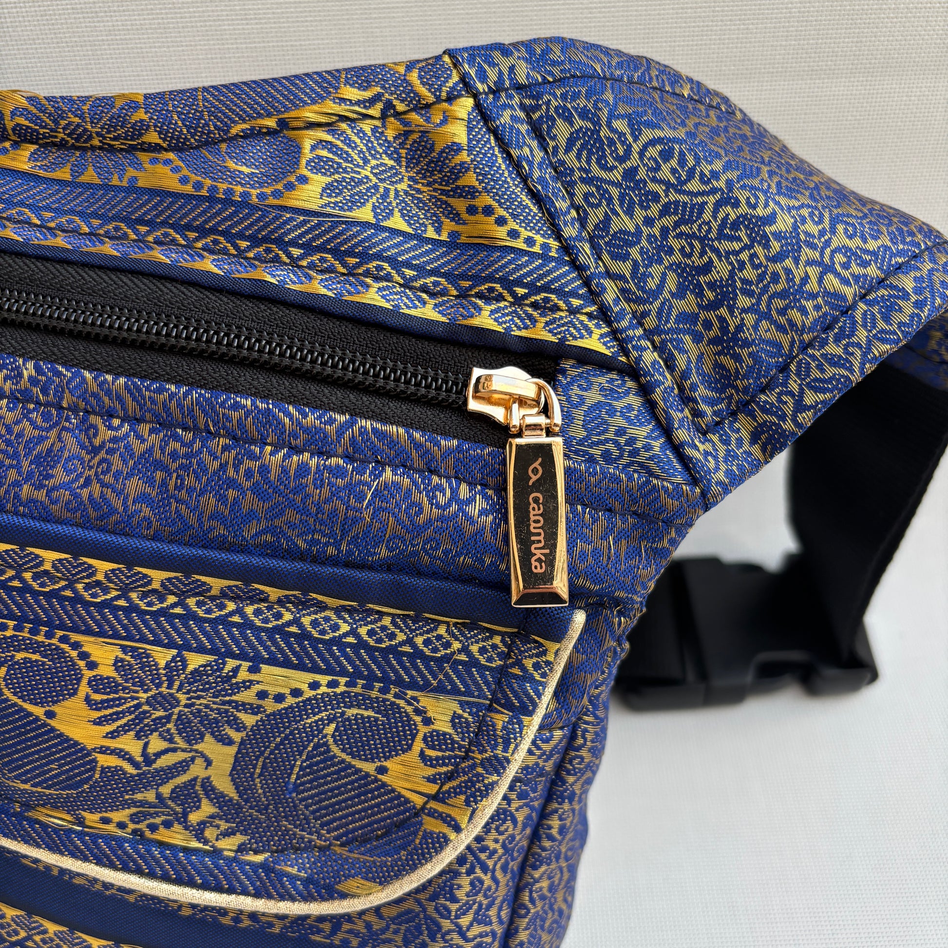 El cuerpo de la riñonera está confeccionado en un tejido brocado azul con motivos ornamentales en dorado, inspirado en los textiles tradicionales de la India, con un patrón rico en detalle y textura.