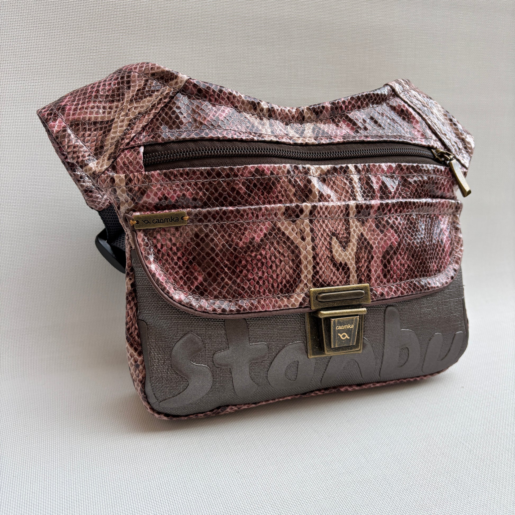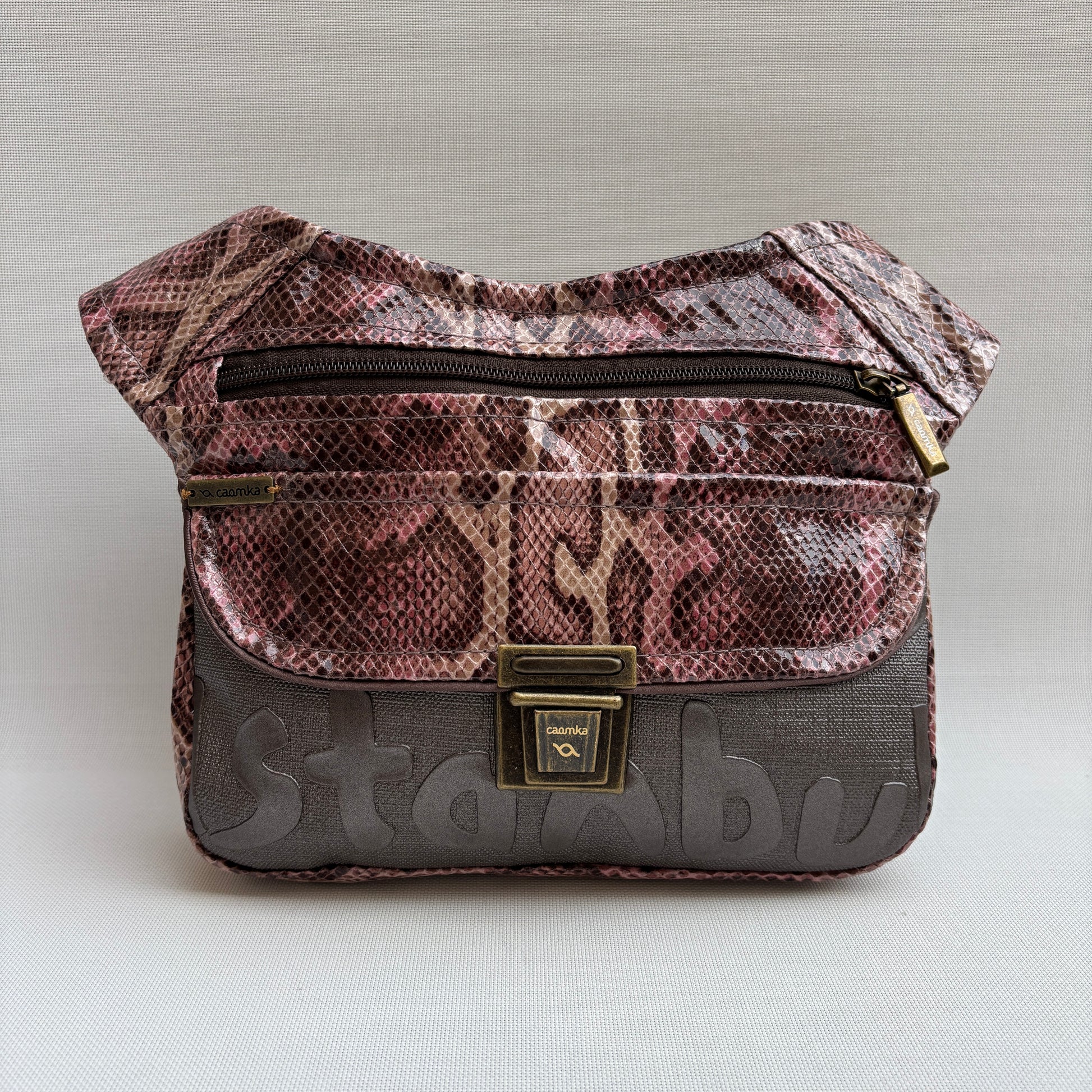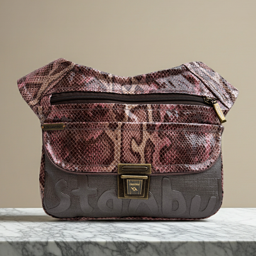Su acabado en polipiel efecto serpiente, con una combinación sofisticada de tonos burdeos, marrones y matices rosados, aporta profundidad visual y un aire elegante sin perder fuerza ni presencia.