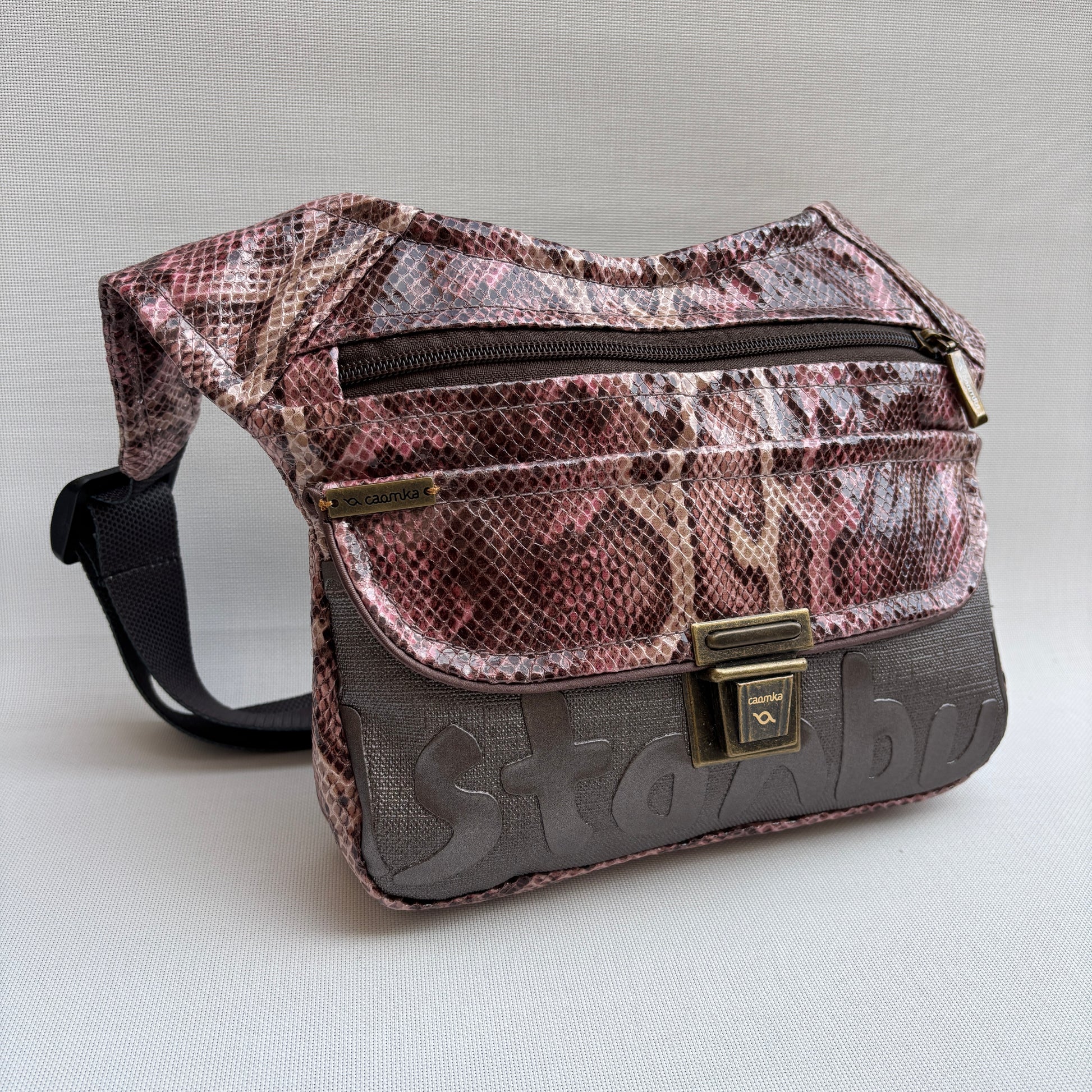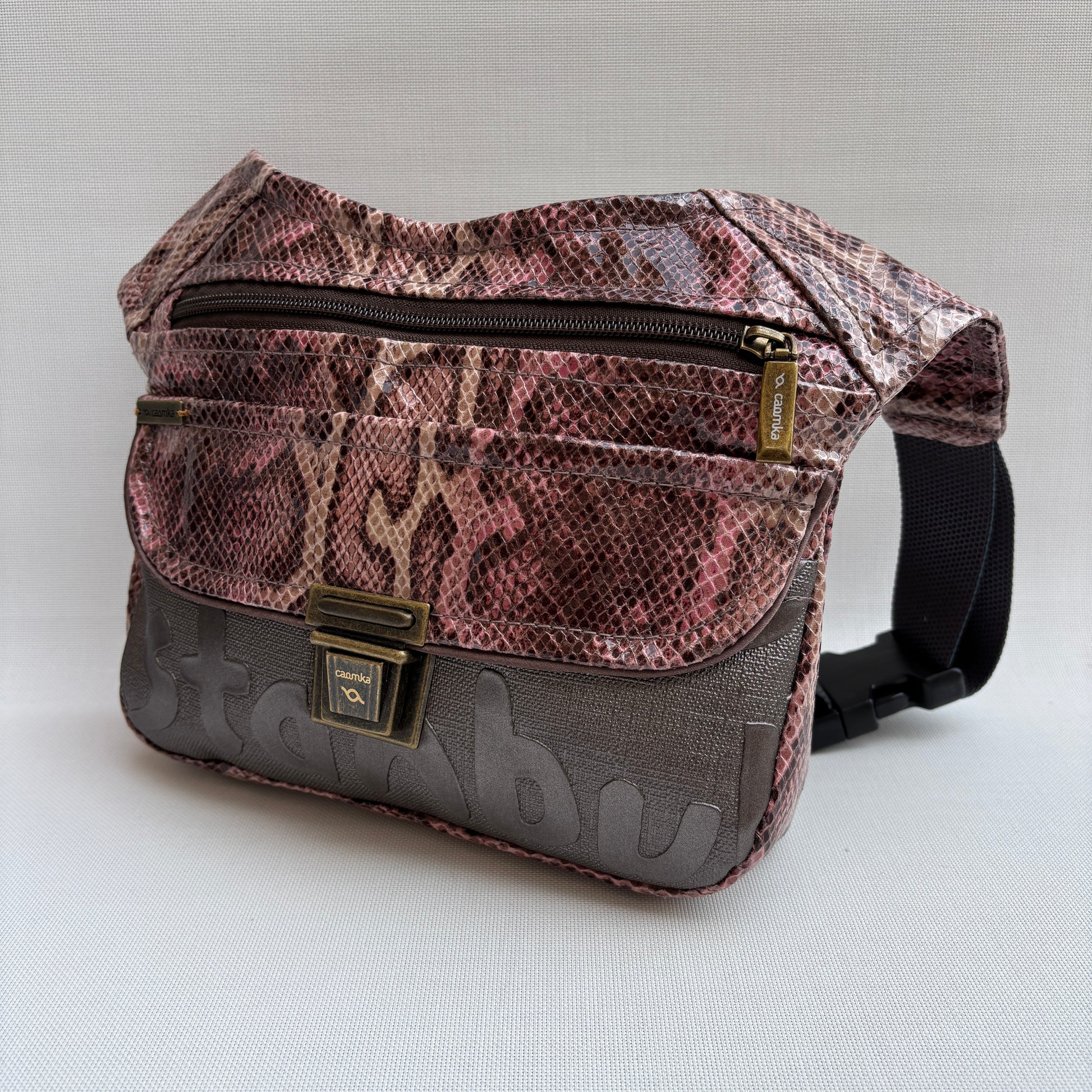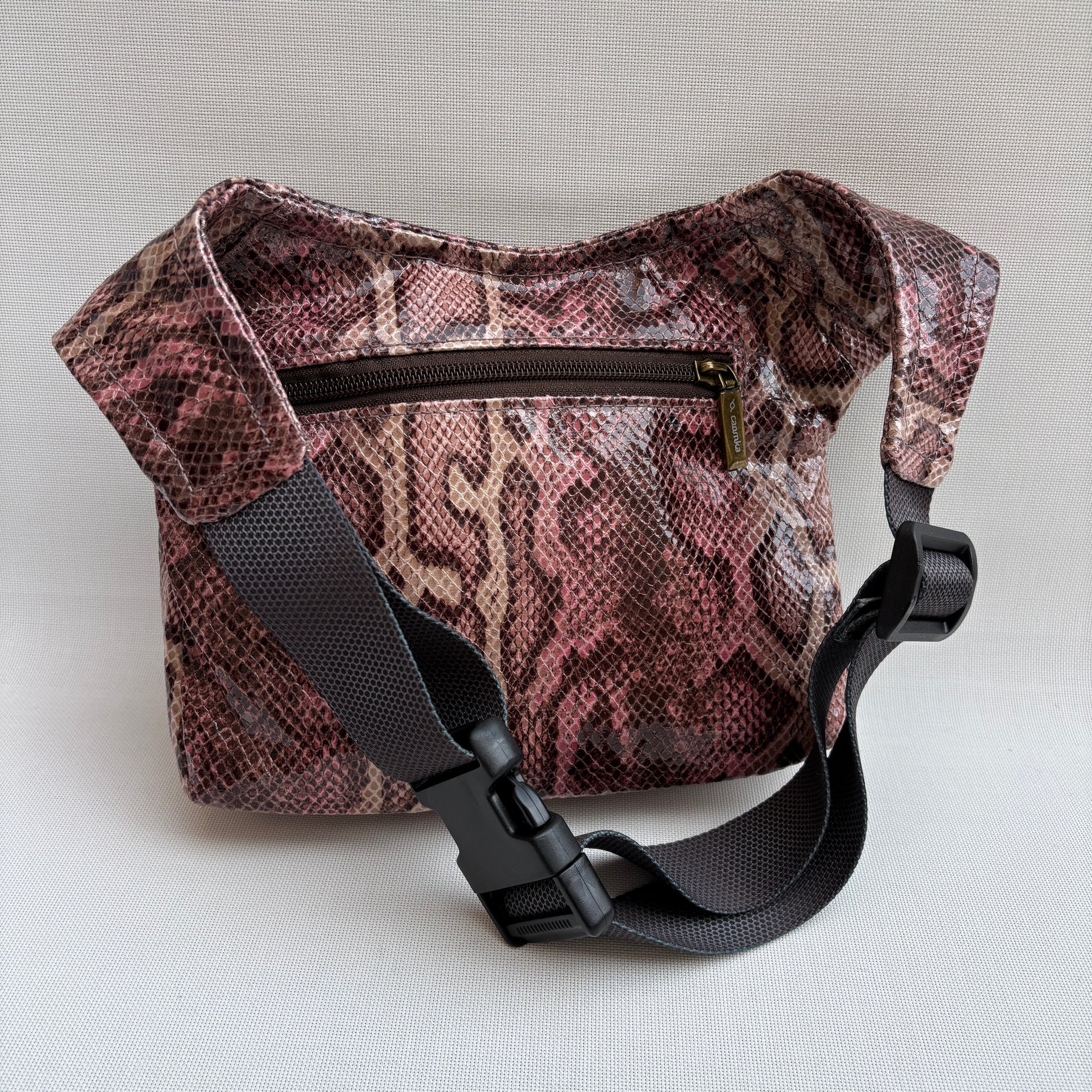 Su acabado en polipiel efecto serpiente, con una combinación sofisticada de tonos burdeos, marrones y matices rosados, aporta profundidad visual y un aire elegante sin perder fuerza ni presencia.