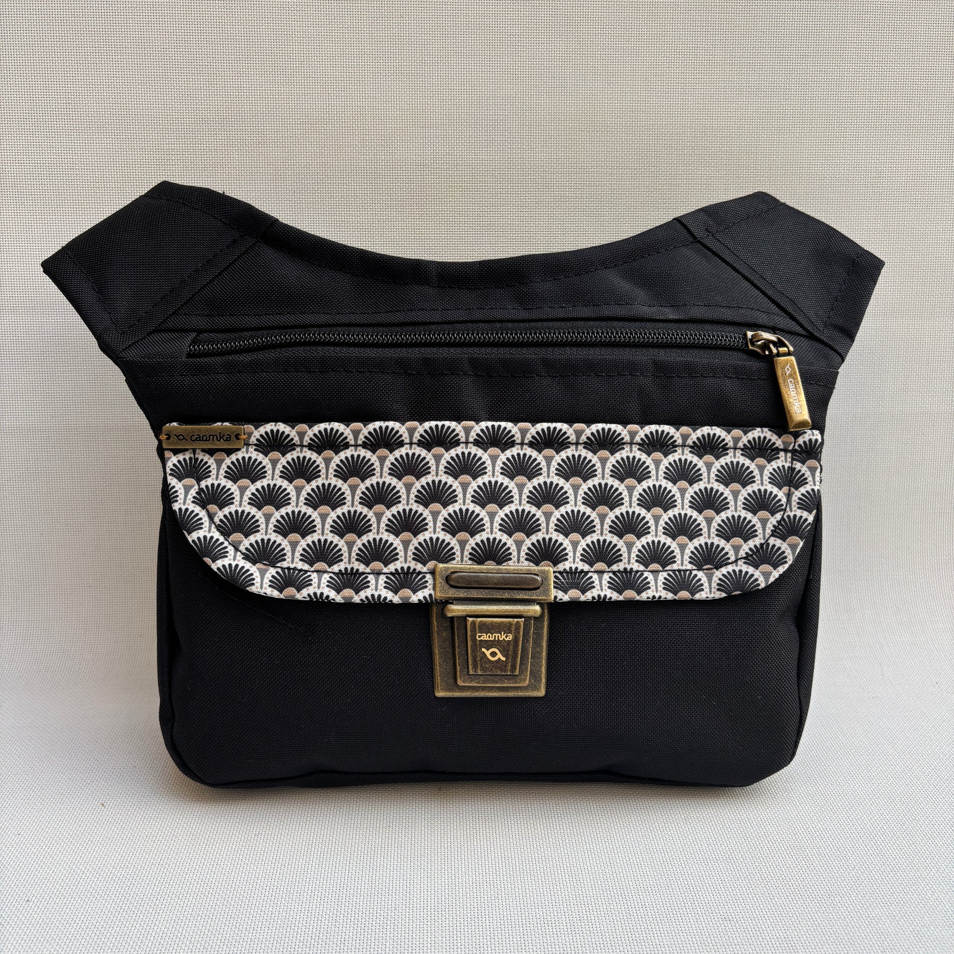 Su base en tejido técnico impermeable negro aporta resistencia, ligereza y funcionalidad para el día a día, mientras que la solapa en tejido estampado de ondas japonesas en tonos beige y gris añade un toque sofisticado y muy reconocible.
