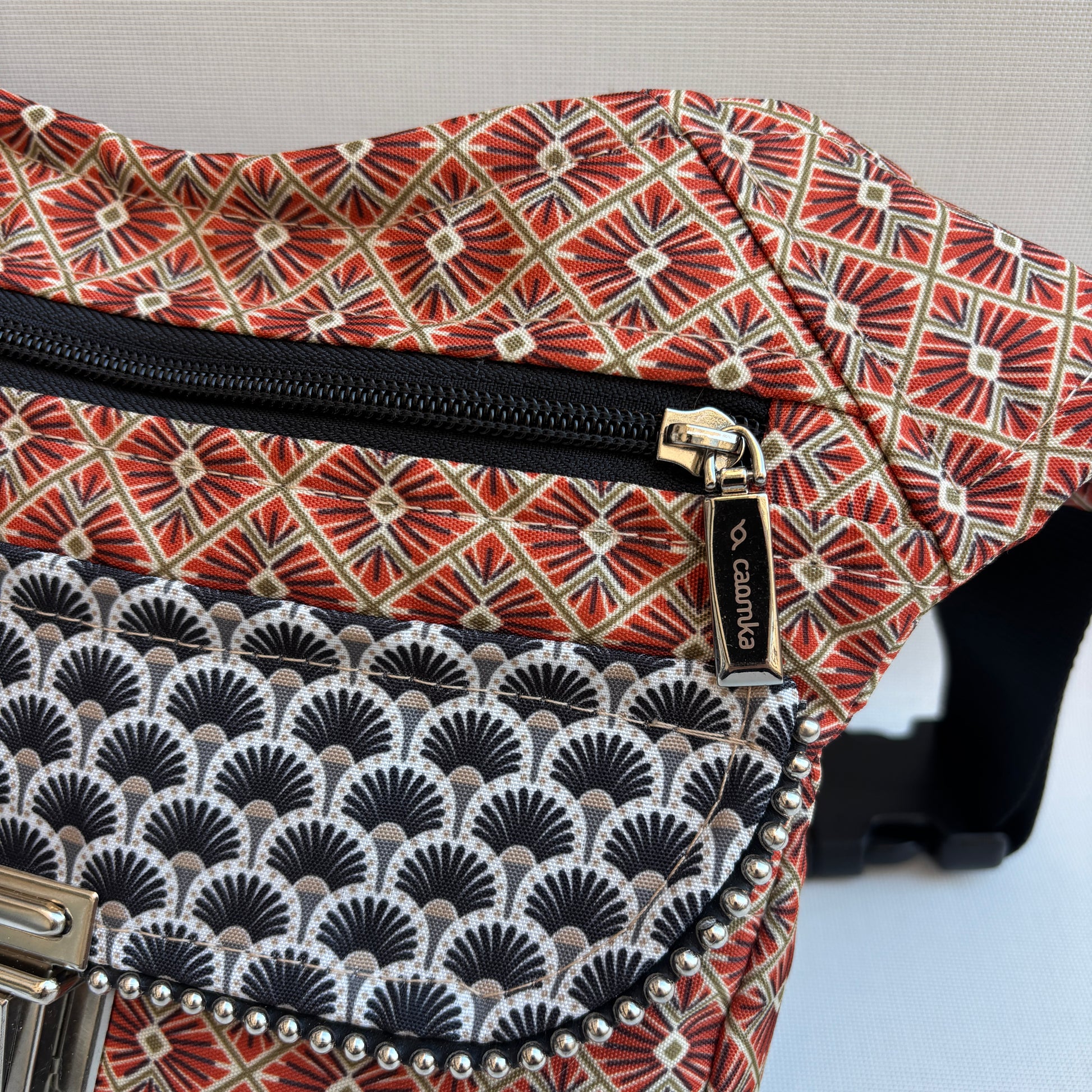 Cuerpo confeccionado en tejido impermeable con estampado geométrico japonés en tonos teja, beige y negro.