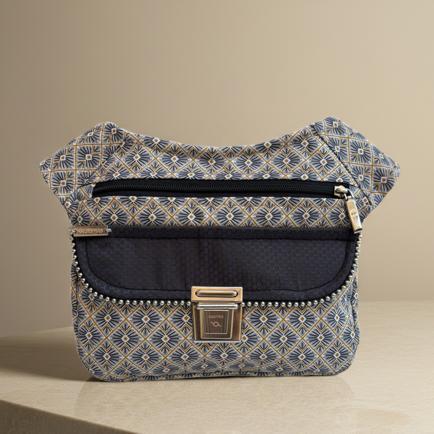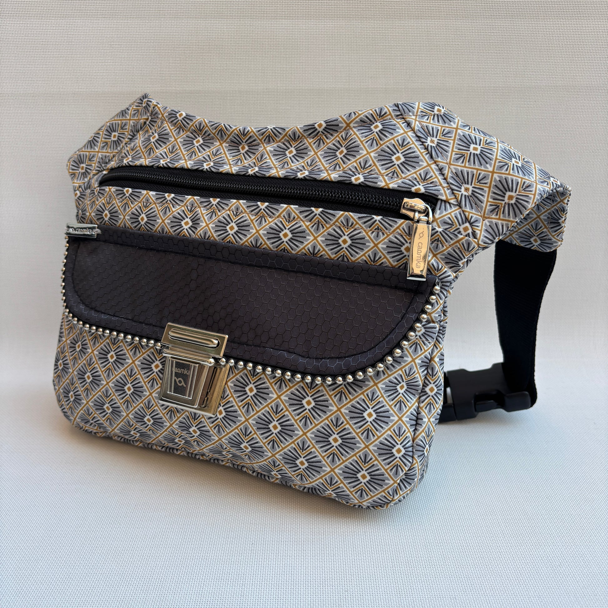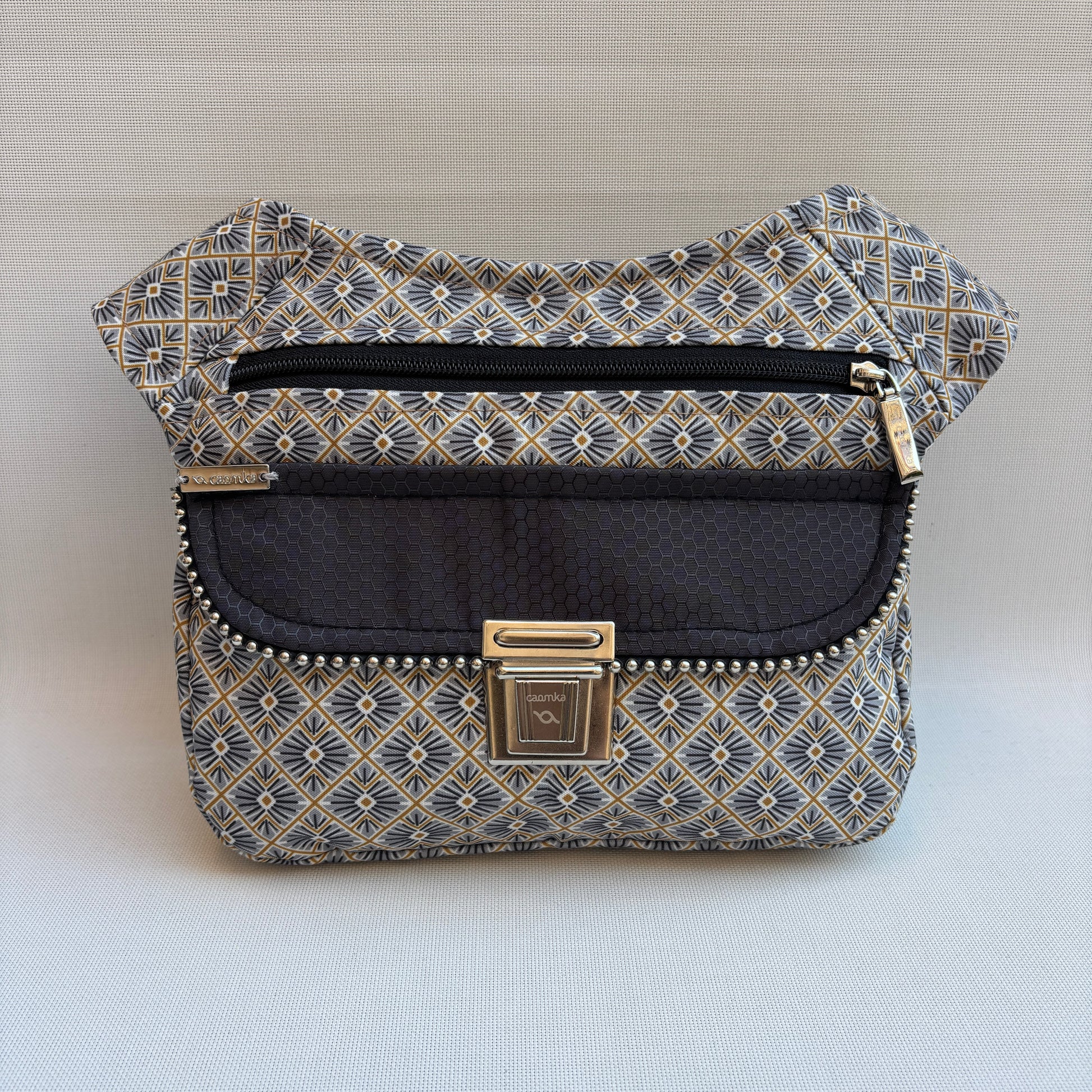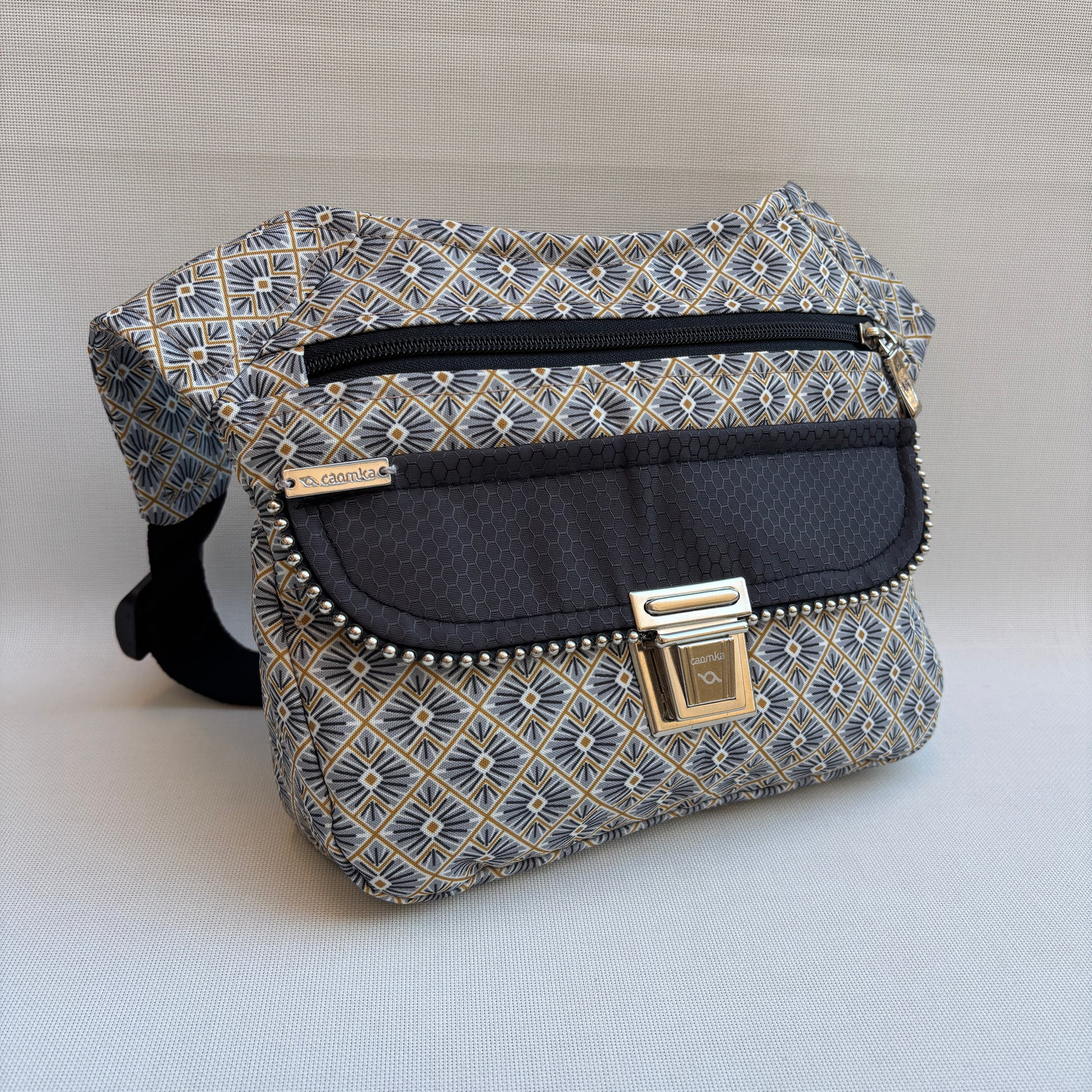 Cuerpo confeccionado en tejido impermeable con estampado geométrico japonés en tonos gris, negro y mostaza
