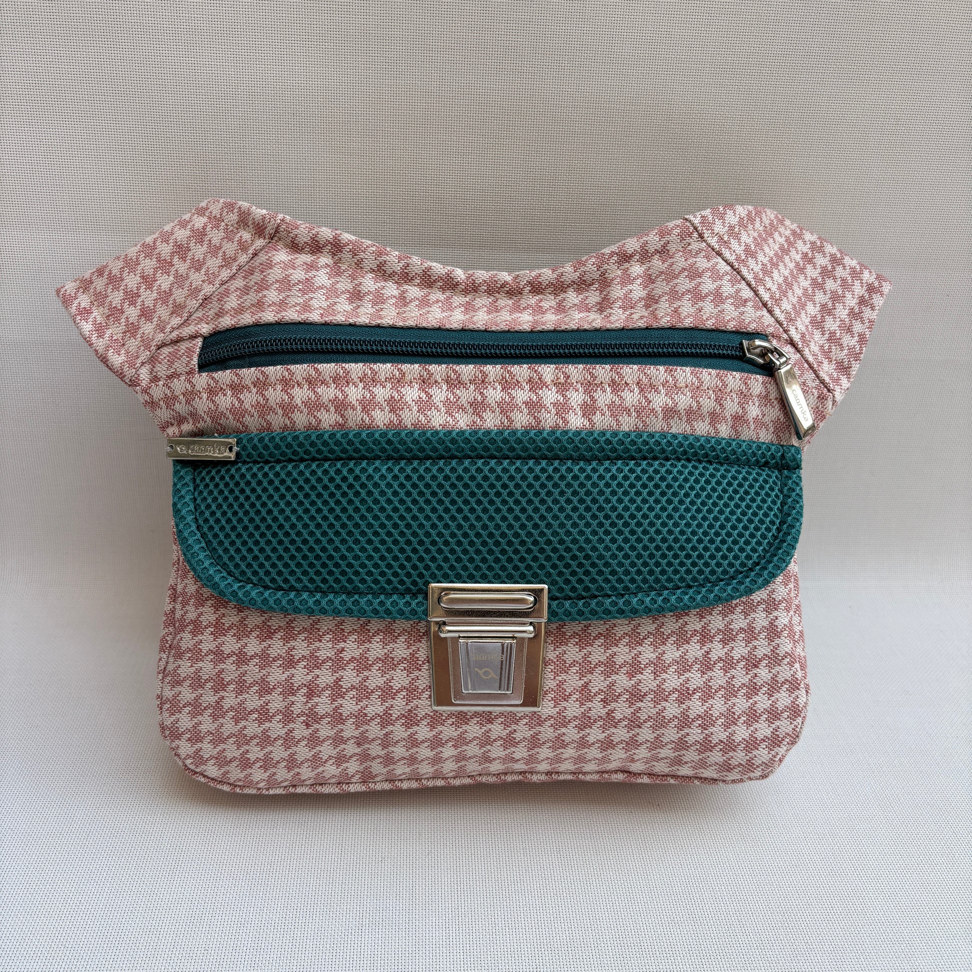La Special Mami Top 18300 es una riñonera con ese equilibrio que enamora: base elegante en pata de gallo rosa y crudo y un frontal en malla técnica verde petróleo que le da frescura, textura y un punto deportivo.