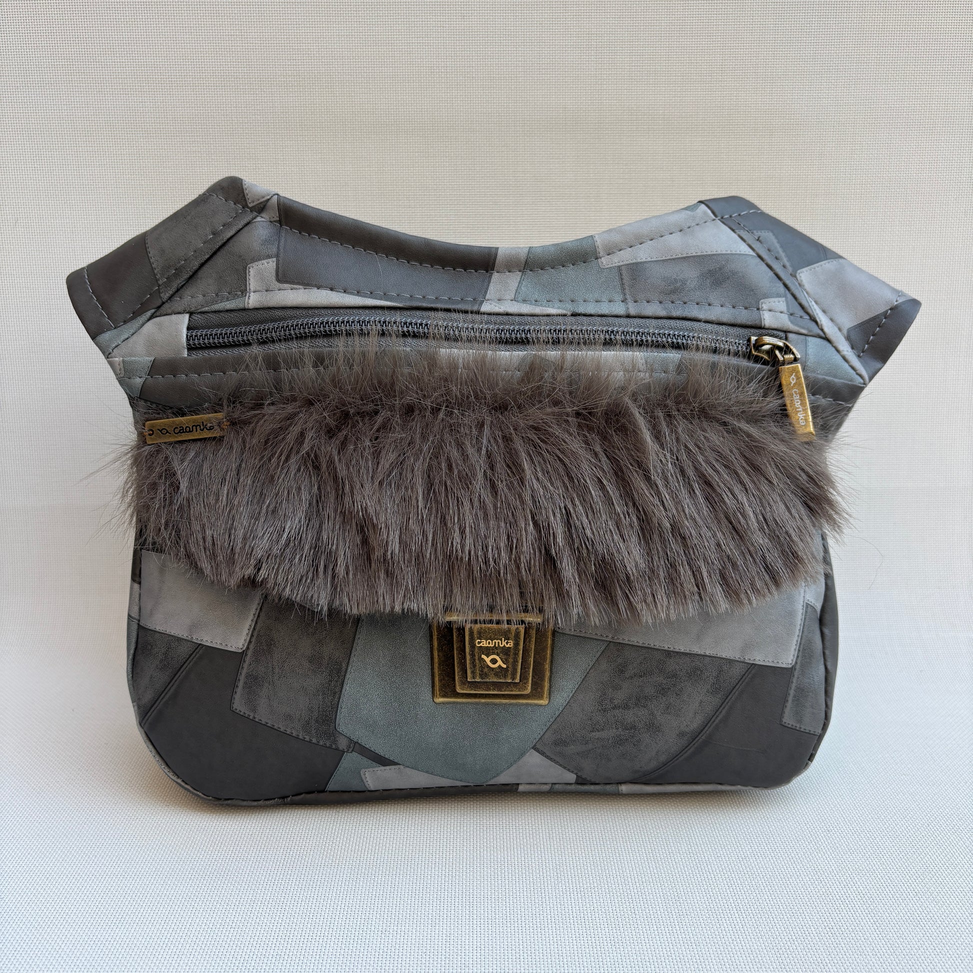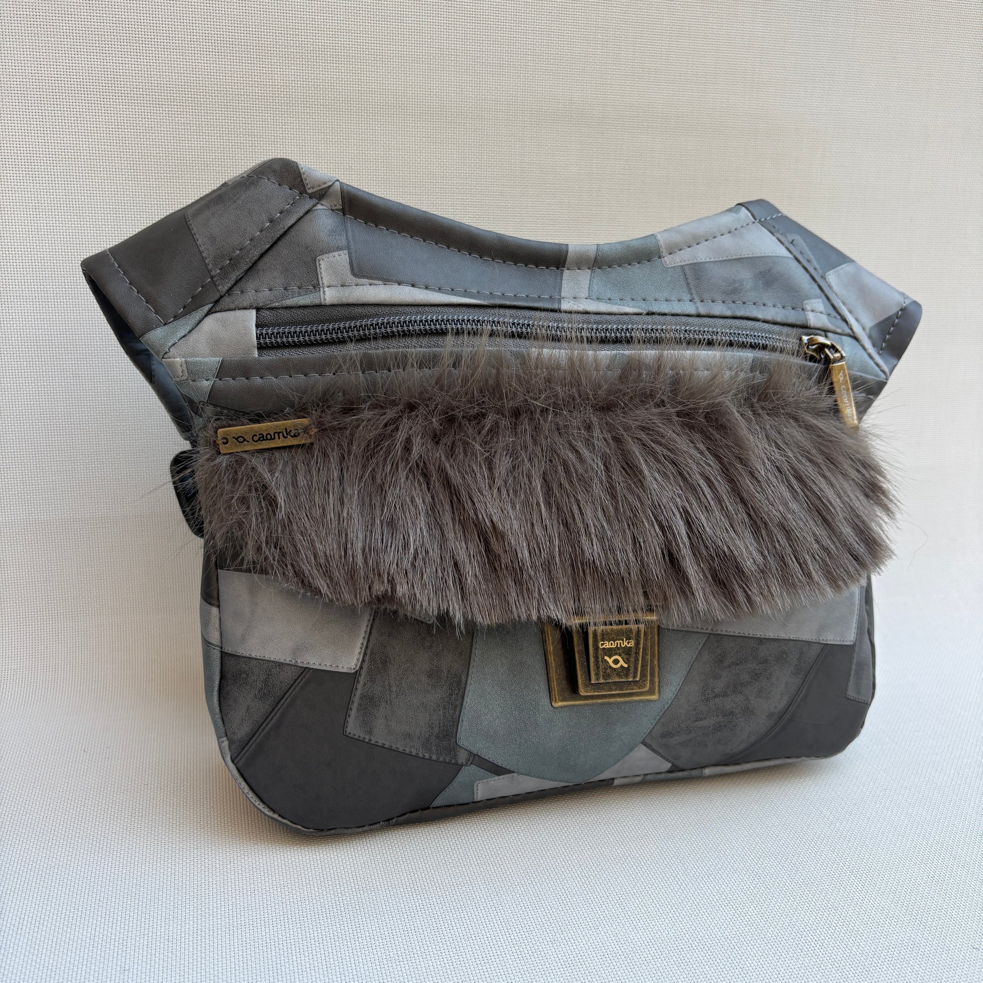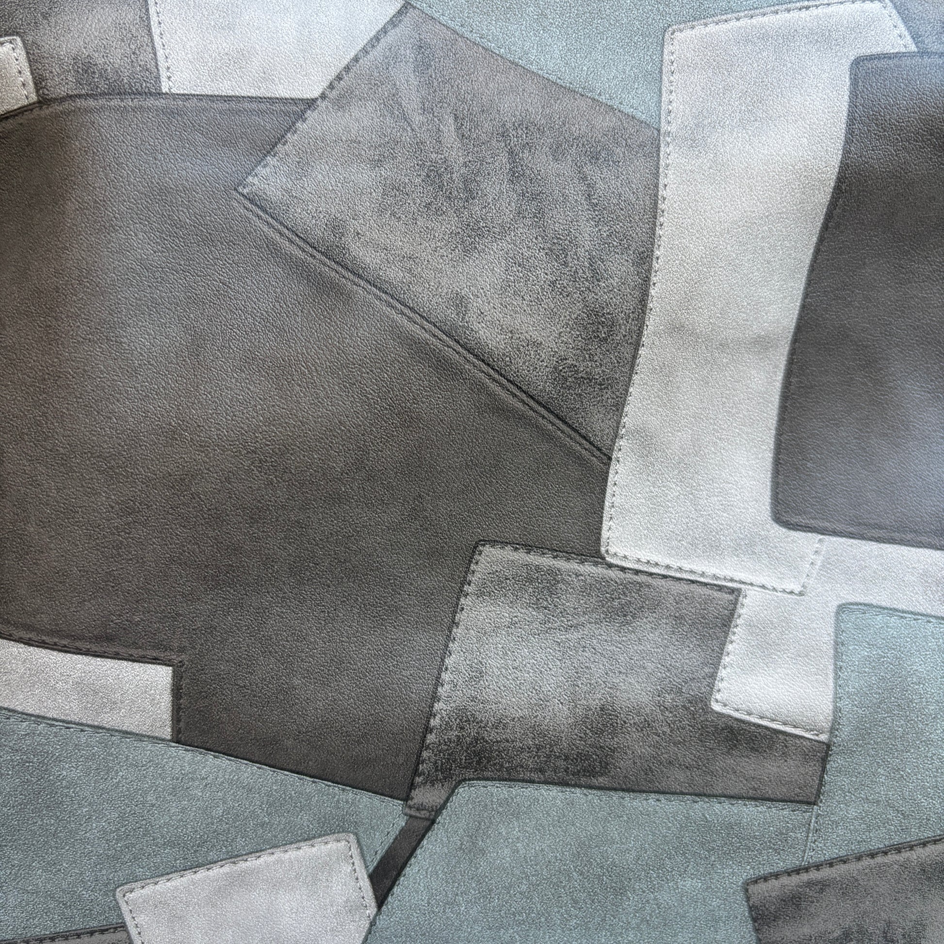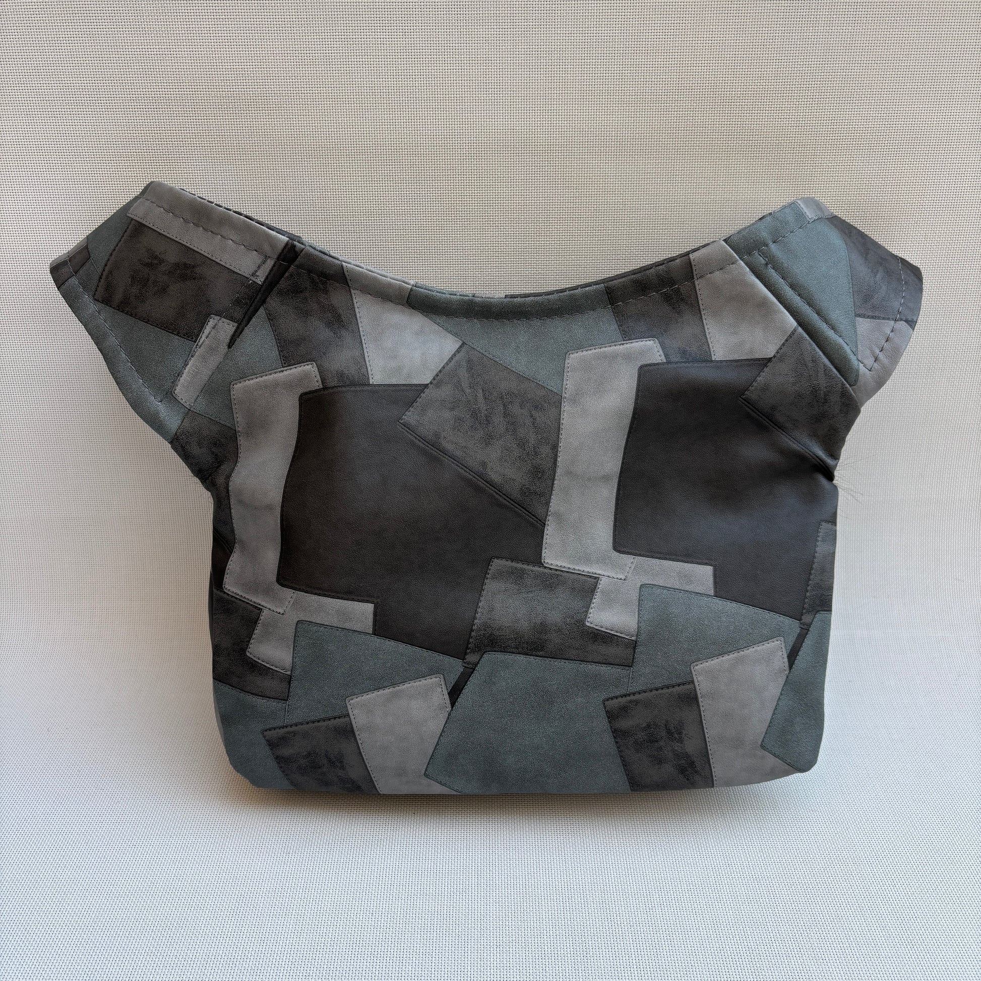 Cuerpo confeccionado en polipiel con diseño patchwork geométrico en tonos gris, antracita y verde humo