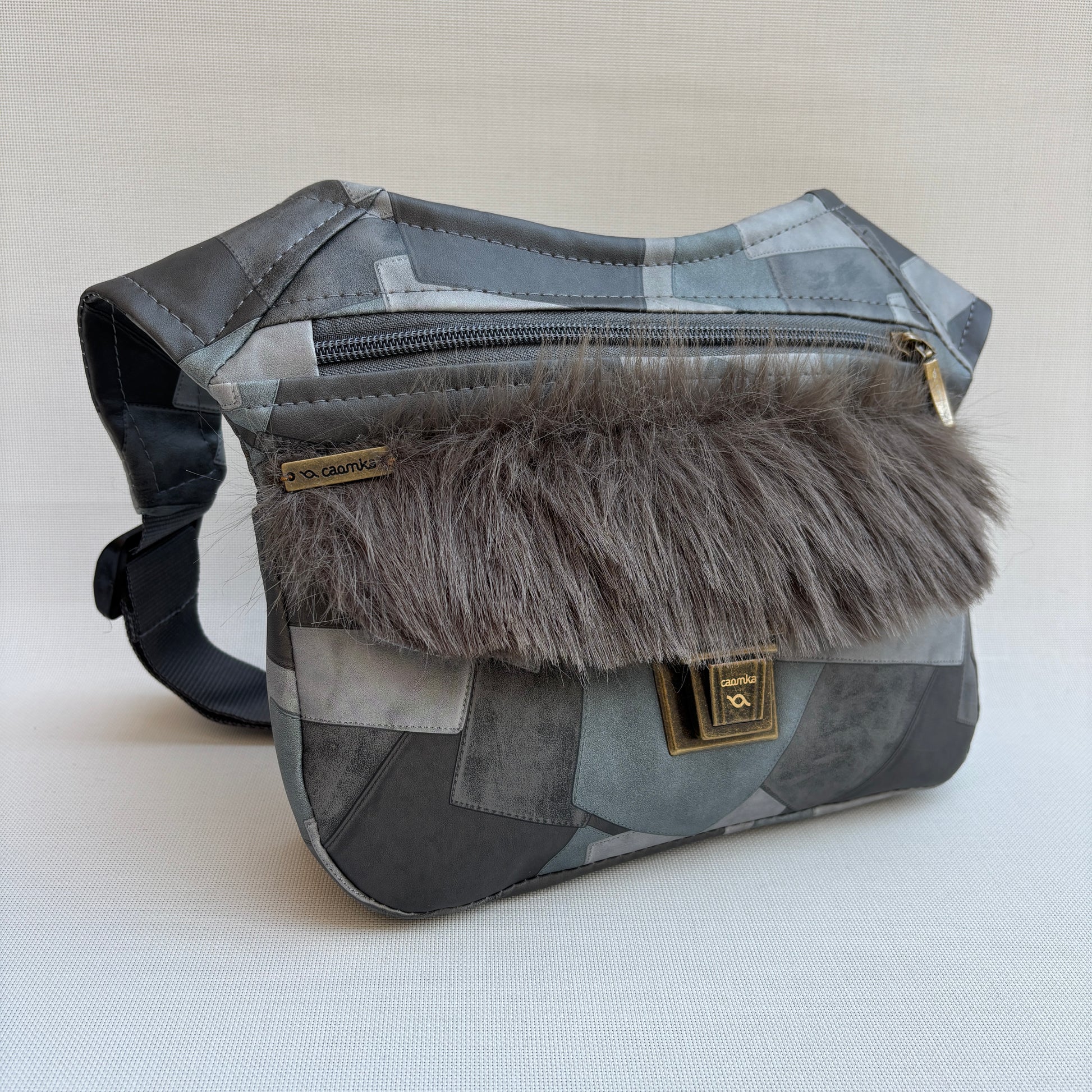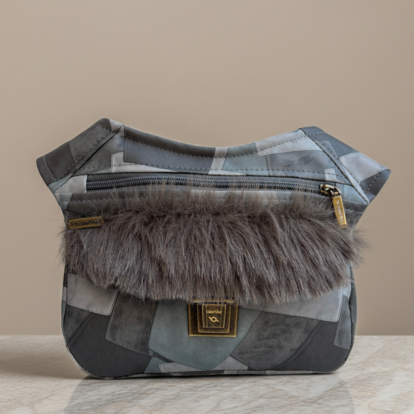 La Special Patchwork Feline 18325 es una riñonera de estética envolvente y contemporánea, donde el patchwork geométrico se combina con una solapa de pelo suave que aporta calidez y personalidad.