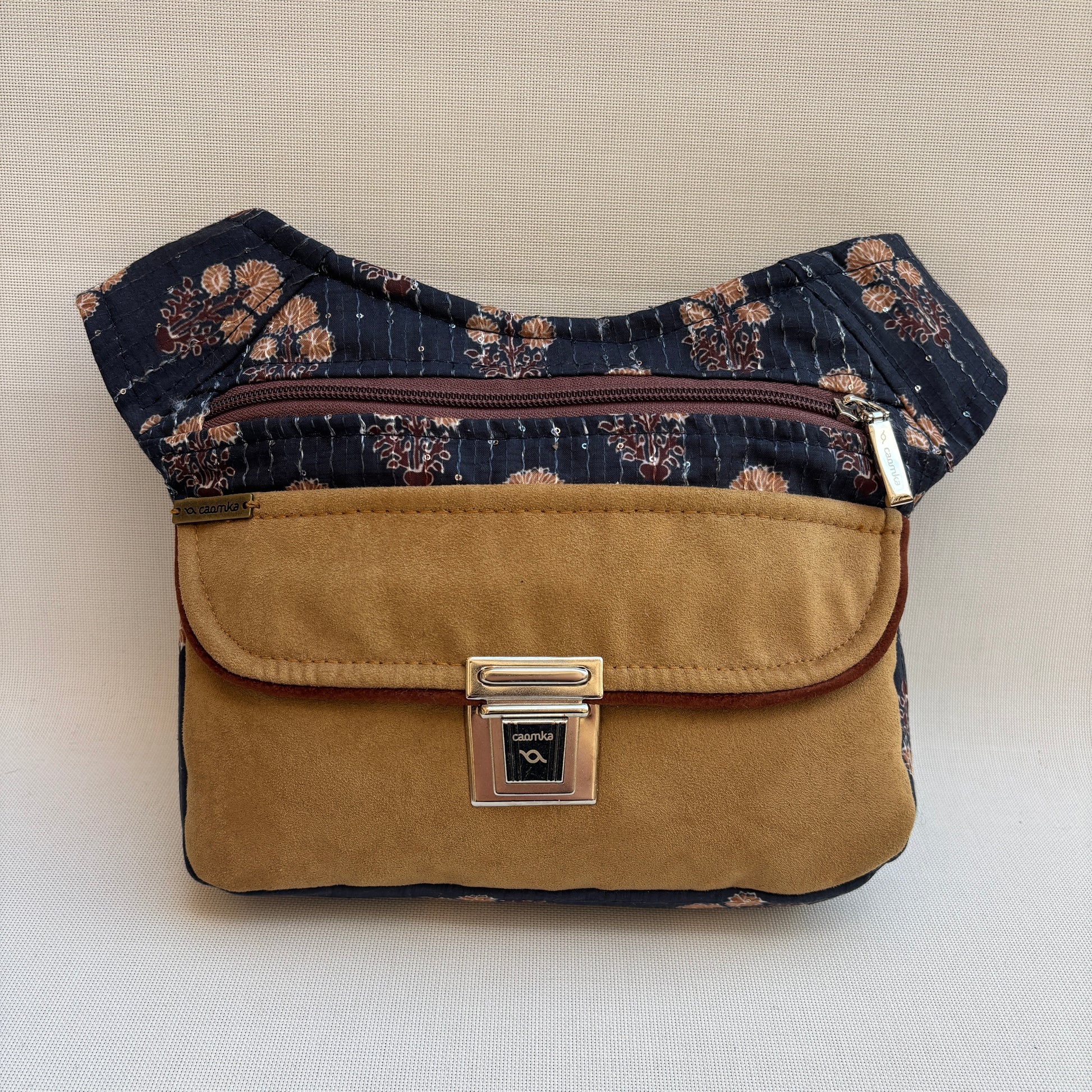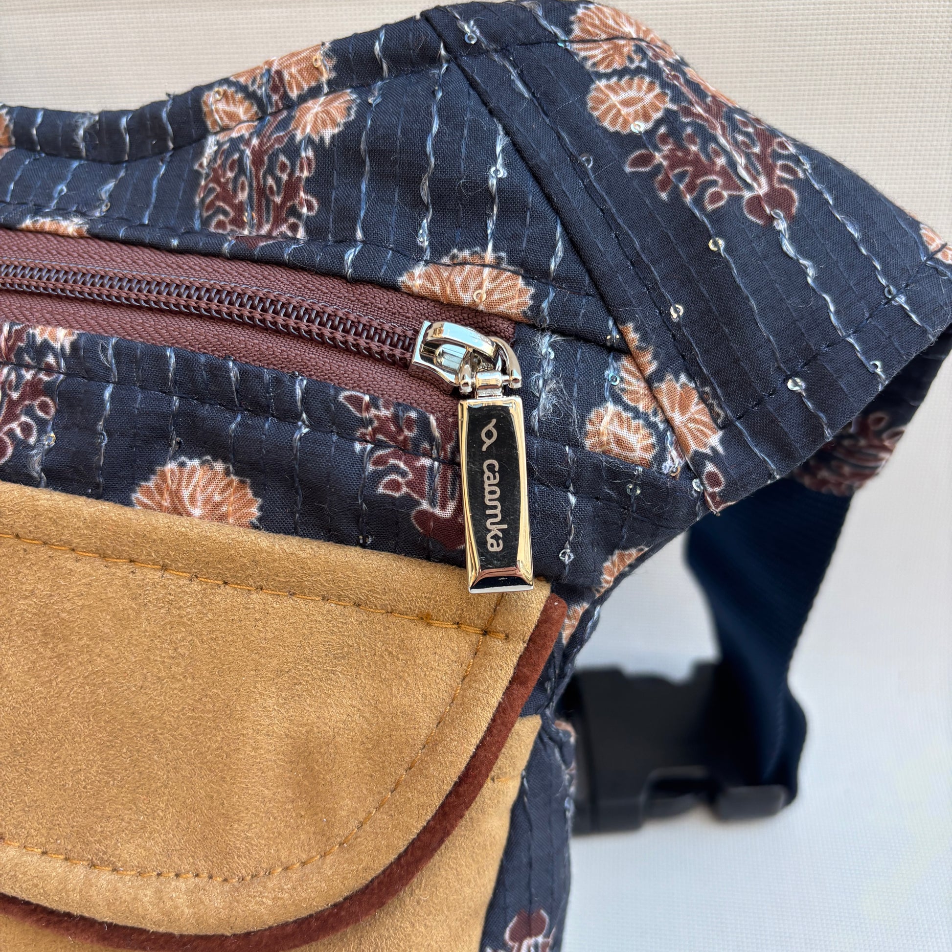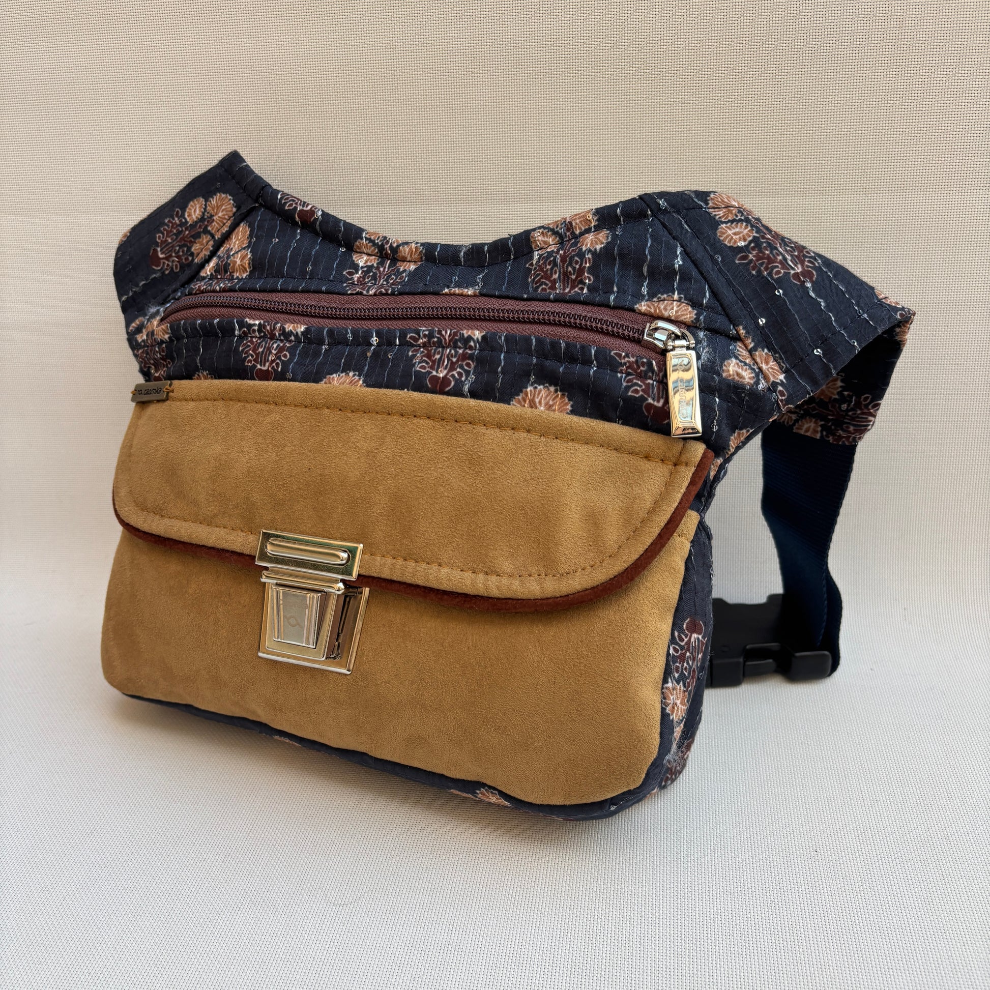 La Special Sweet India 18465 es una riñonera equilibrada y delicada, confeccionada en un tejido de inspiración india con pequeños motivos florales en tonos tierra sobre fondo azul noche.