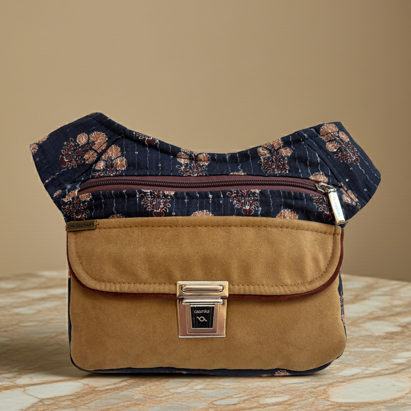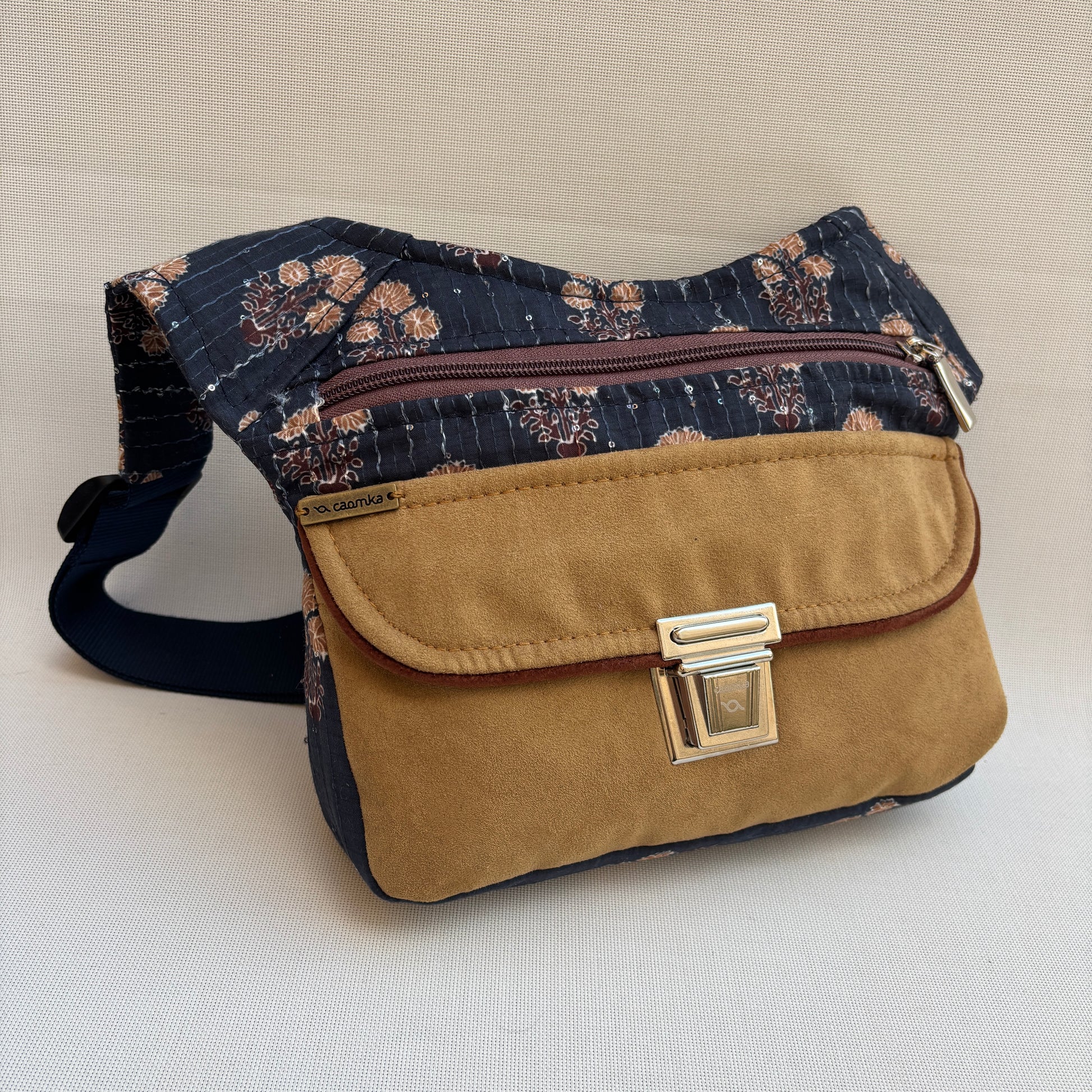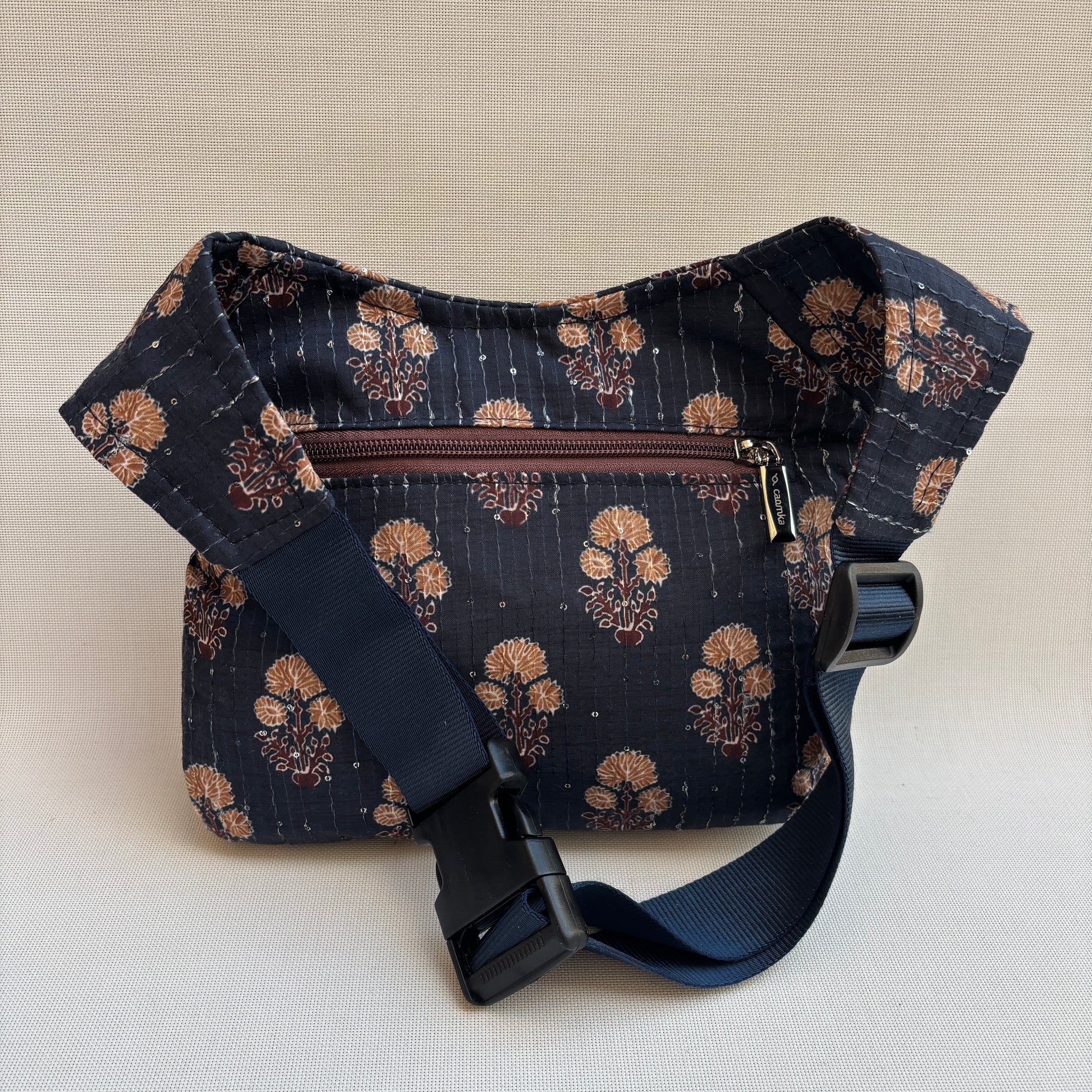 La Special Sweet India 18465 es una riñonera equilibrada y delicada, confeccionada en un tejido de inspiración india con pequeños motivos florales en tonos tierra sobre fondo azul noche.