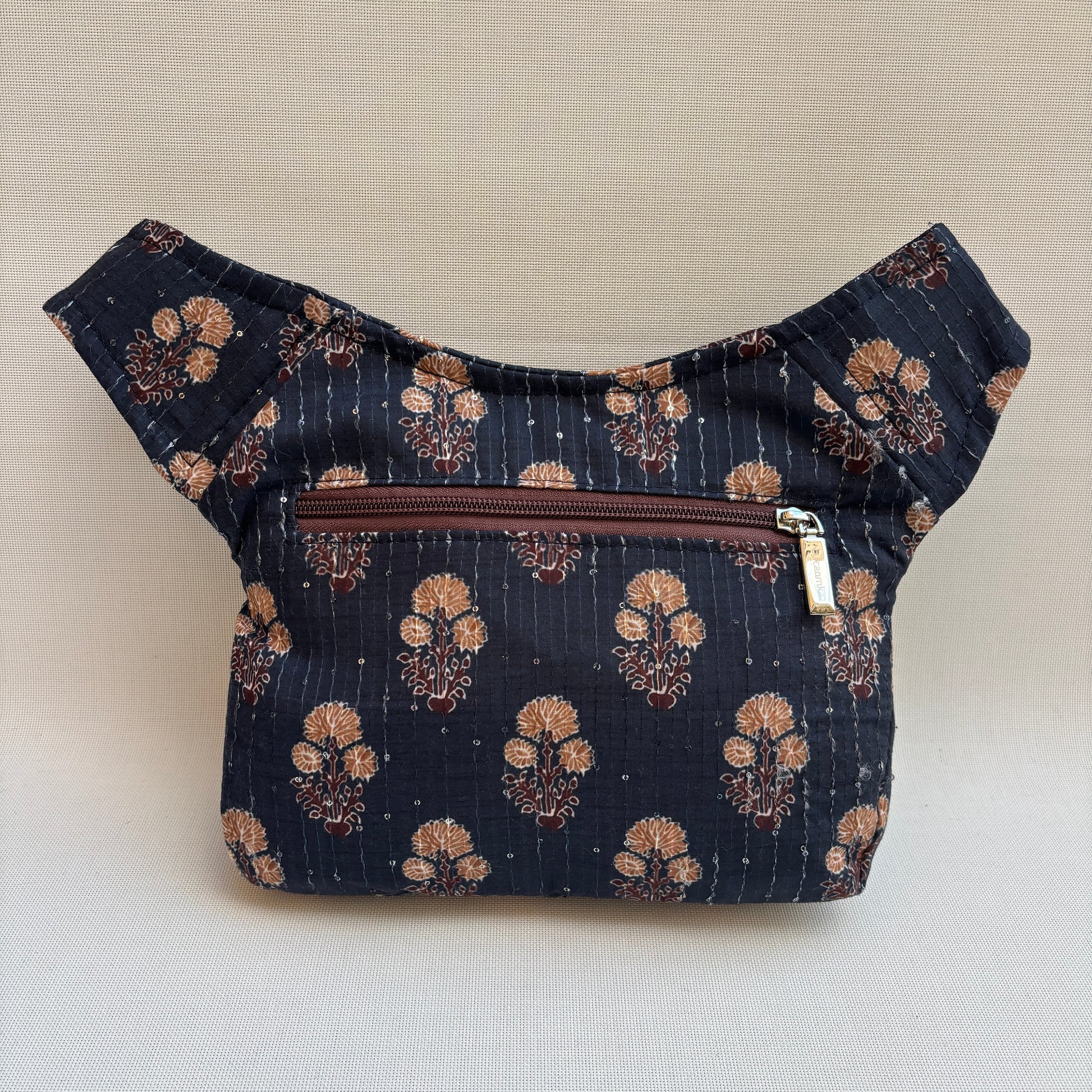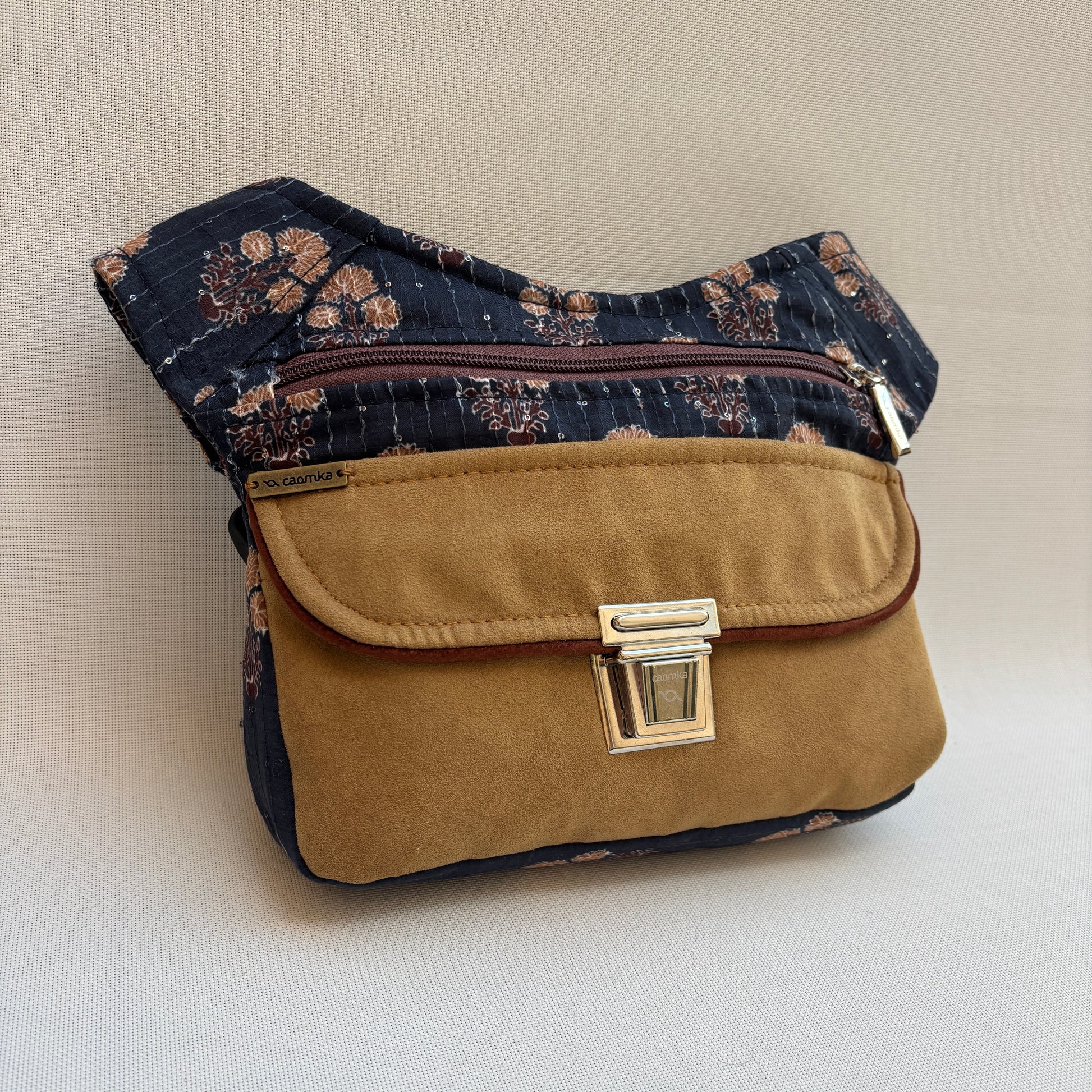 Cuerpo principal en tejido estampado de inspiración india, con delicados motivos florales en tonos tierra.