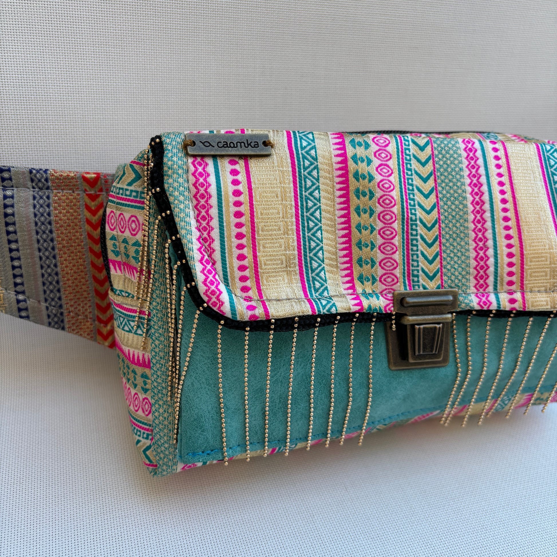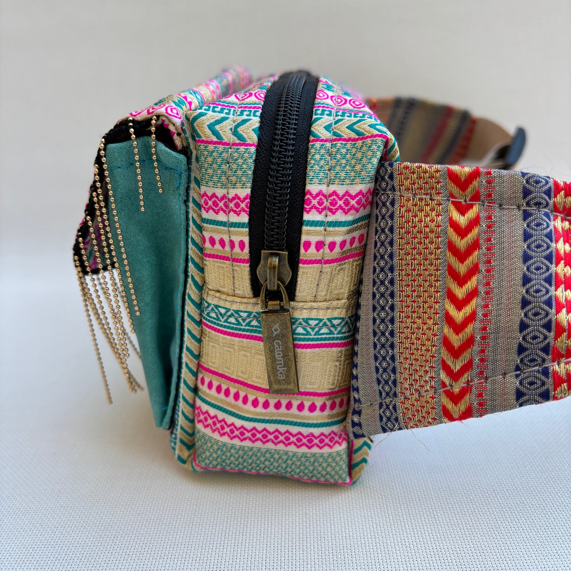 Inspirada en los tejidos tradicionales de la India, combina patrones geométricos en tonos turquesa, fucsia y dorado que aportan luz y carácter. El contraste con los laterales y la cinta multicolor refuerza su personalidad única, mientras que los detalles en cadenas doradas añaden un toque sofisticado y diferencial.