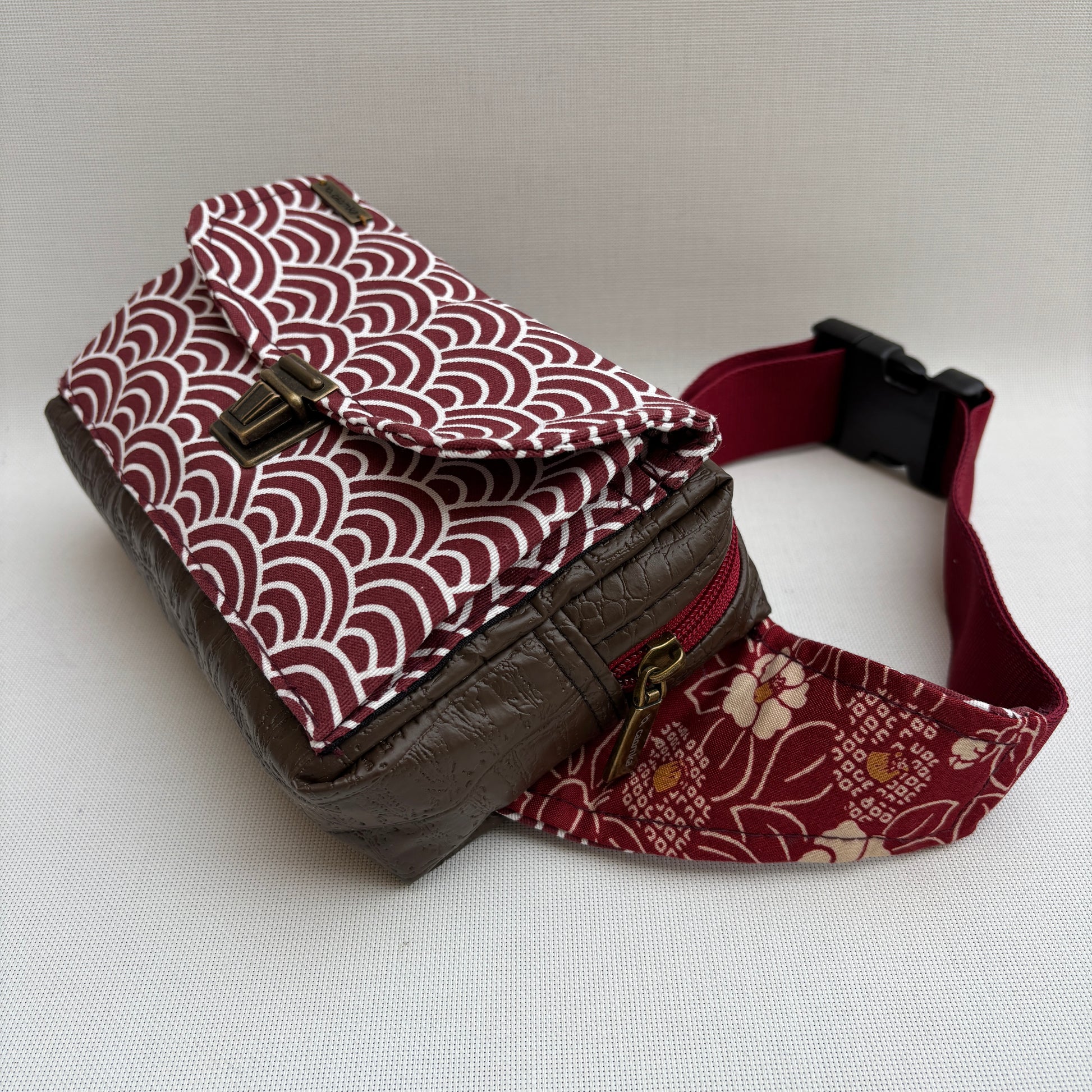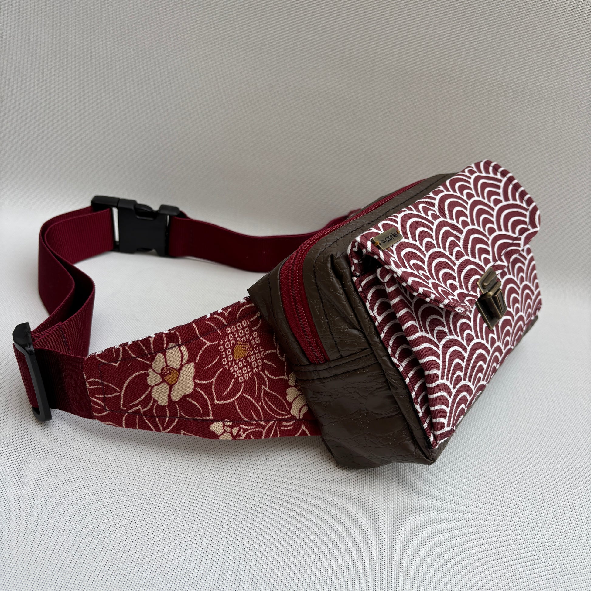 Correa combinada en granate con tejido floral integrado, ajustable con cierre de clip.