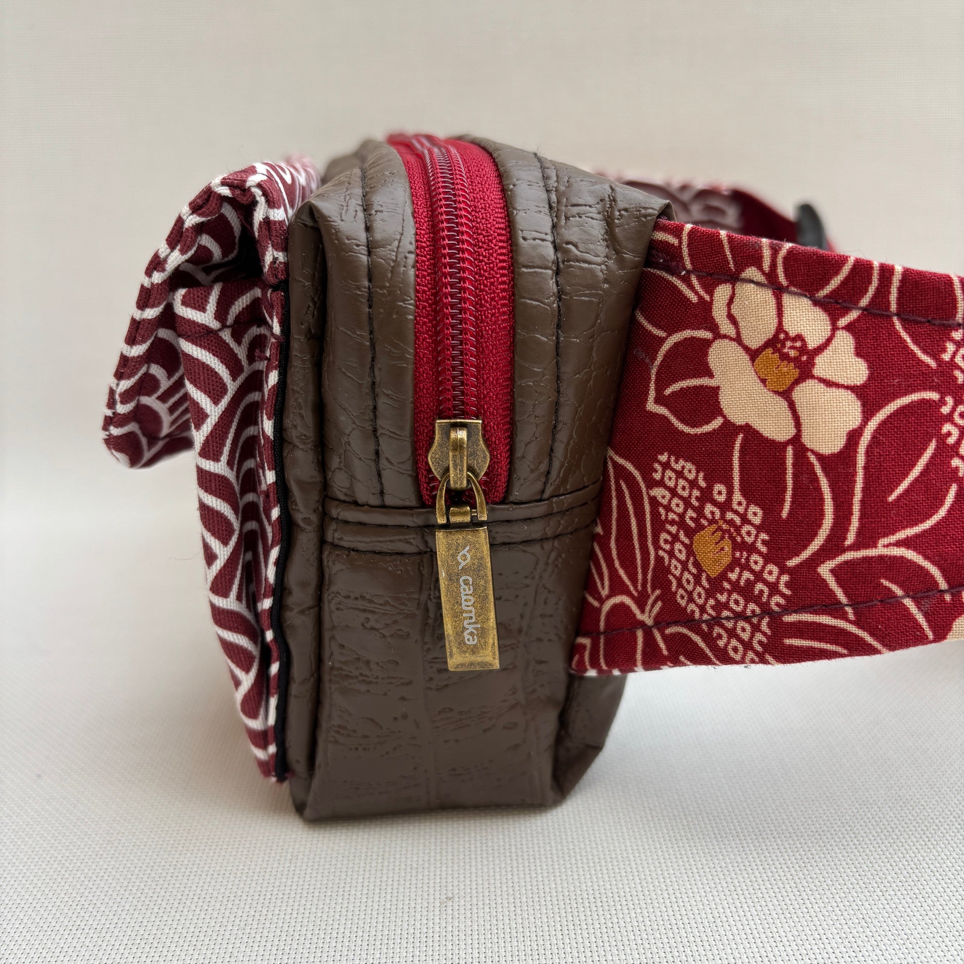 Cremallera superior en tono granate con tirador metálico personalizado Caomka.