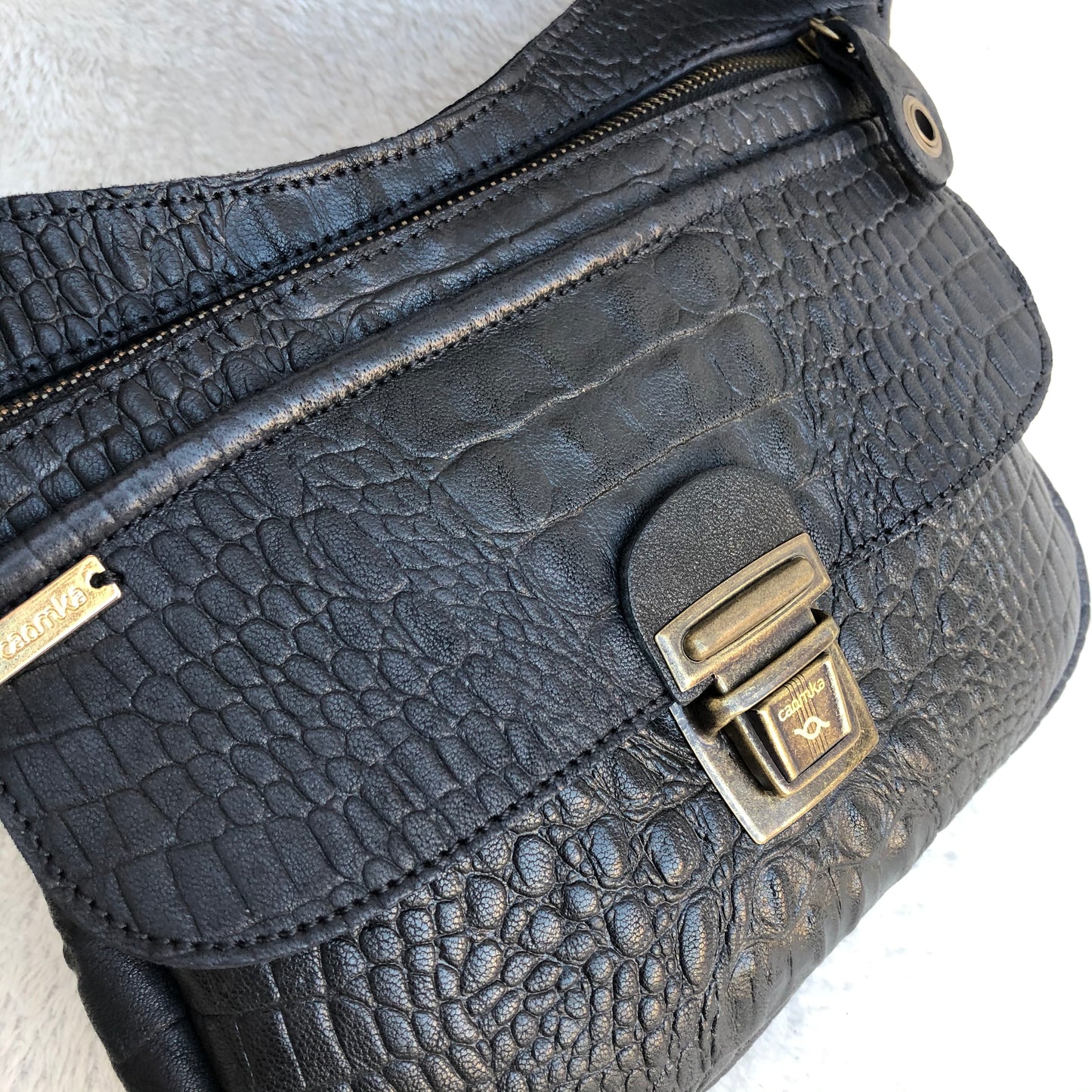 Bolsillo trasero extra con cremallera en Oro Viejo y tirador especial de piel.