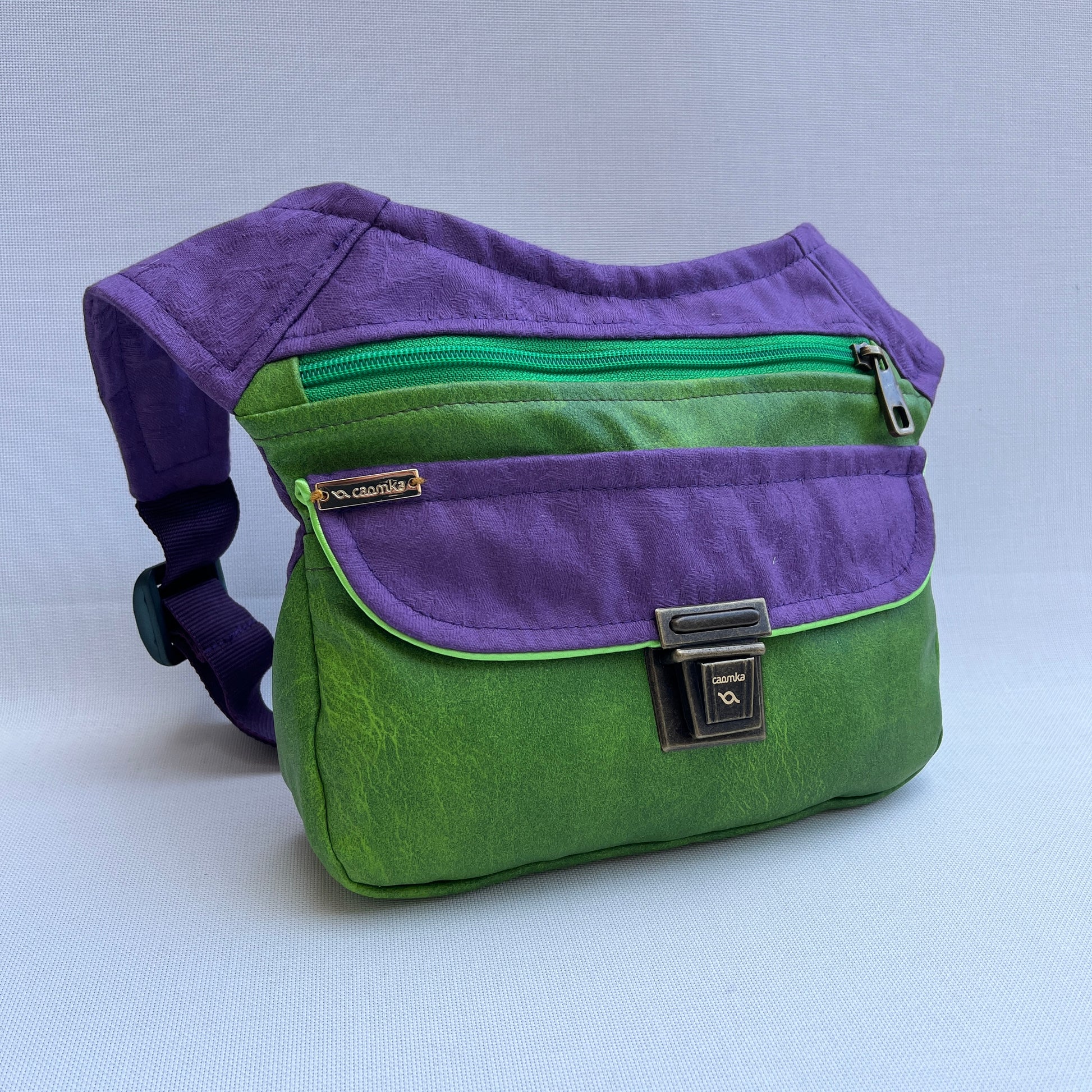 Cinta de ajuste regulable en nylon lila a juego con cierre en verde oscuro de 4cm.