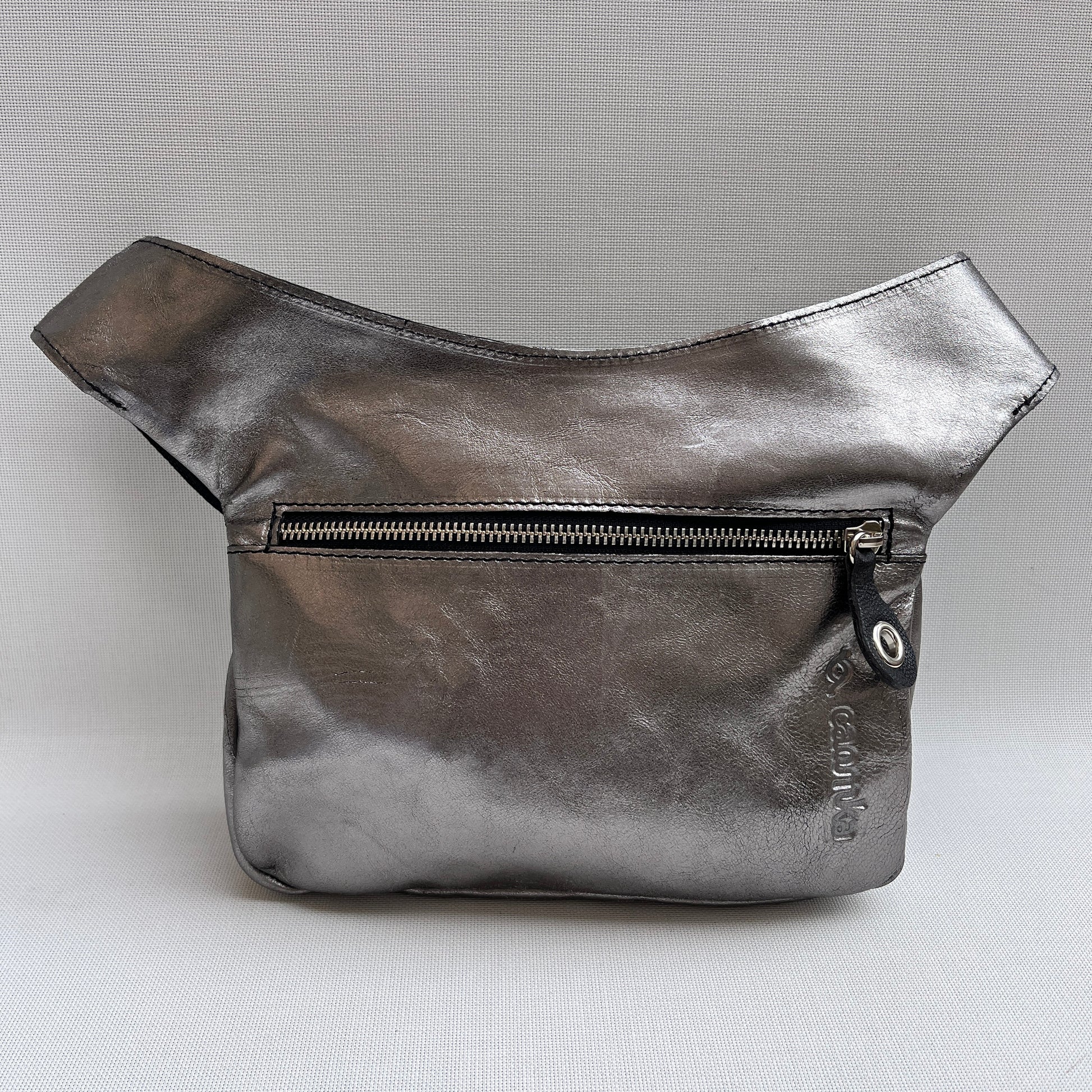 Bolsillo trasero extra con cremallera en Plata y tirador especial de piel.