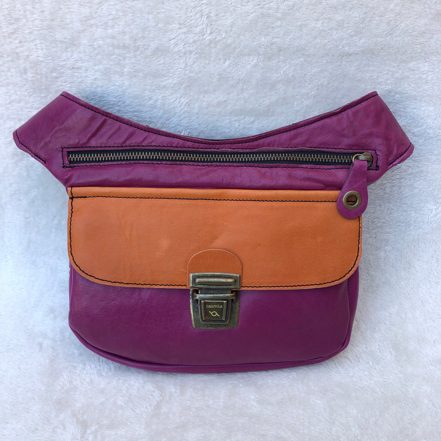 PIEL COLOR LILA-MORADO CON SOLAPA CALABAZA-MARRÓN